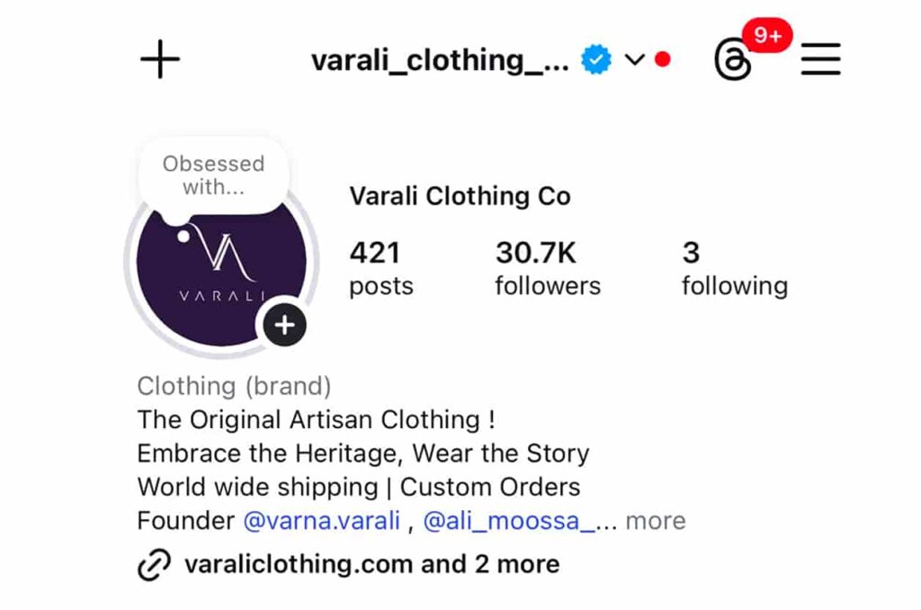 Varali Clothing Co. reached 30.7K followers with a blue verified badge and 1.2M+ monthly profile views through targeted content and engagement strategy.