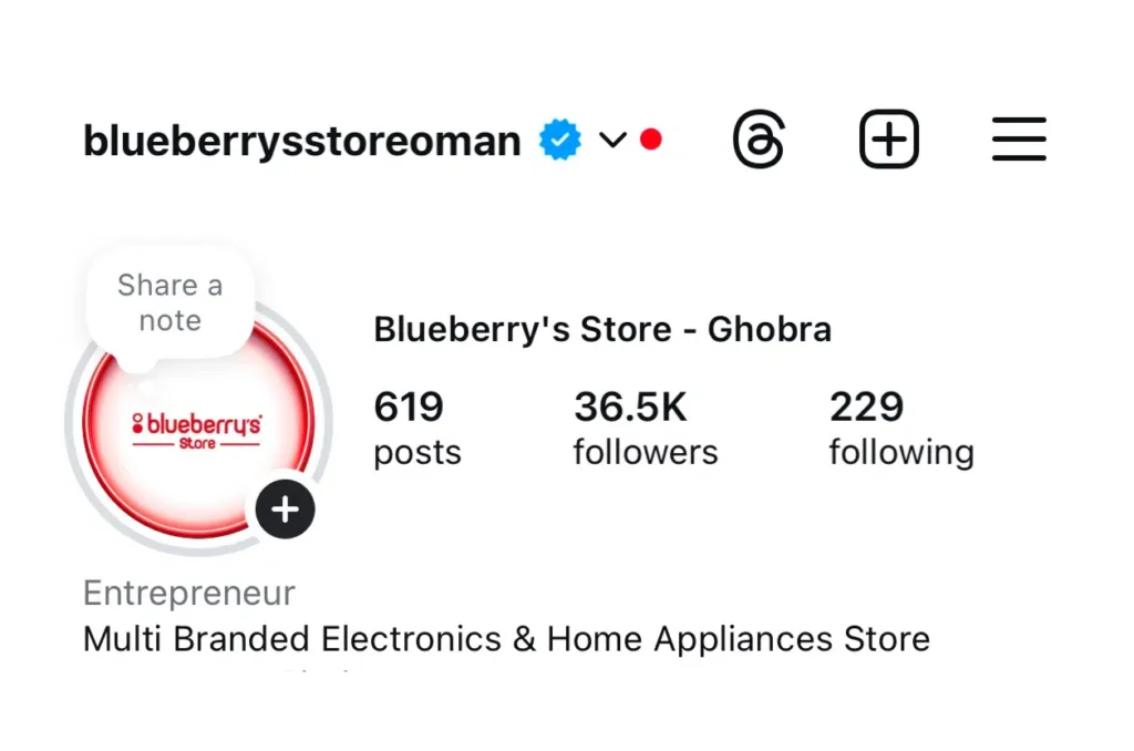 Multi-branded electronics store in Oman. Scaled to 36.5K followers with 1.5M+ monthly views. Blue verified badge earned through consistent brand authority.